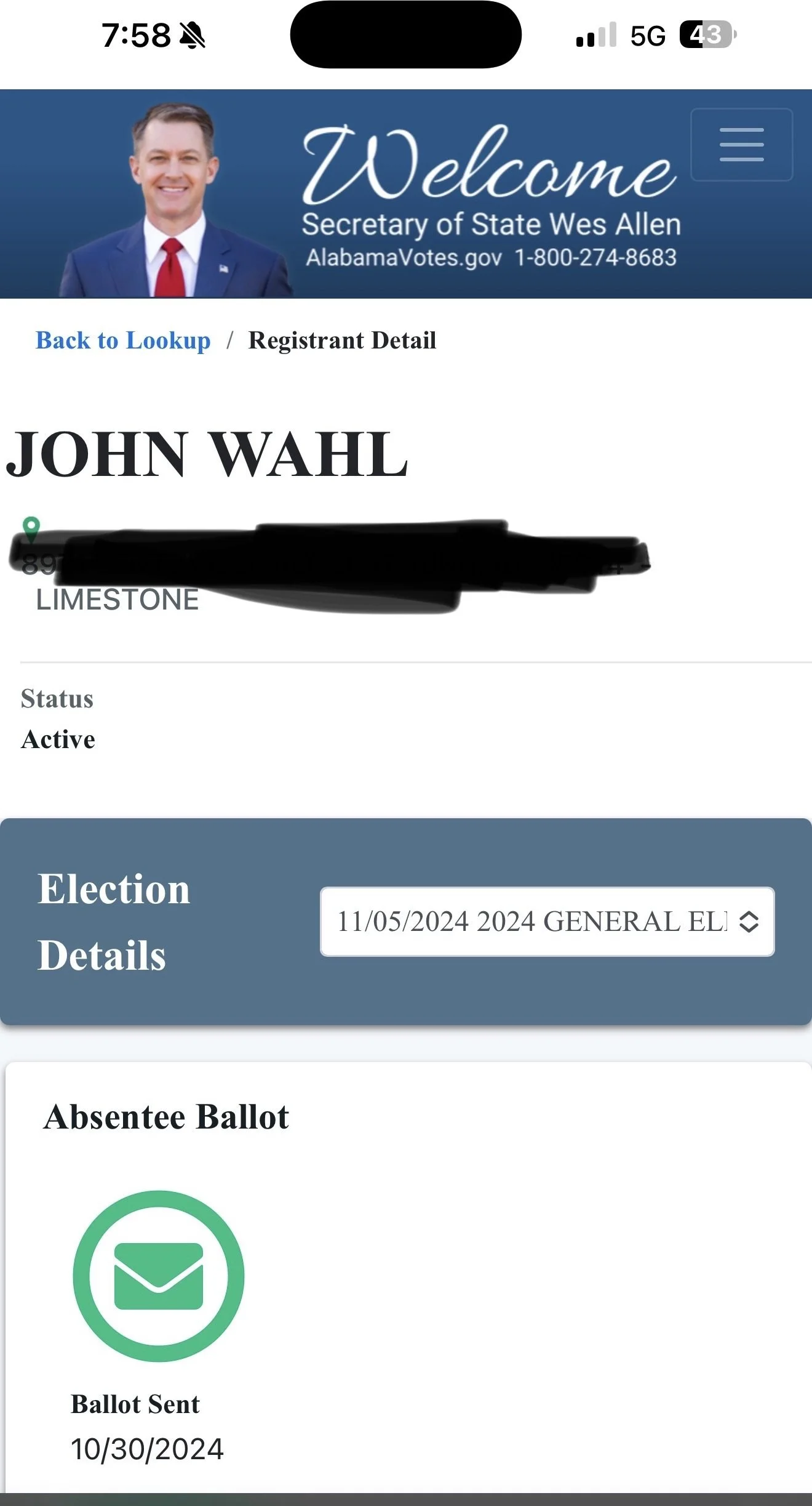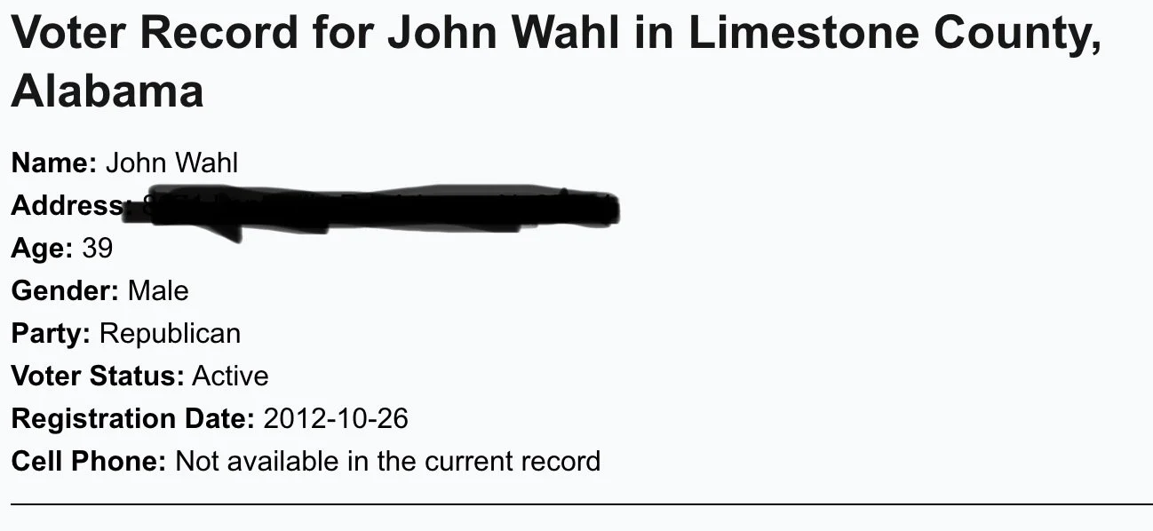 At the same time, Alabama voter records list him under the name John Wahl. Secretary of State website even shows that he cast an absentee ballot in the November 2024 presidential election.
